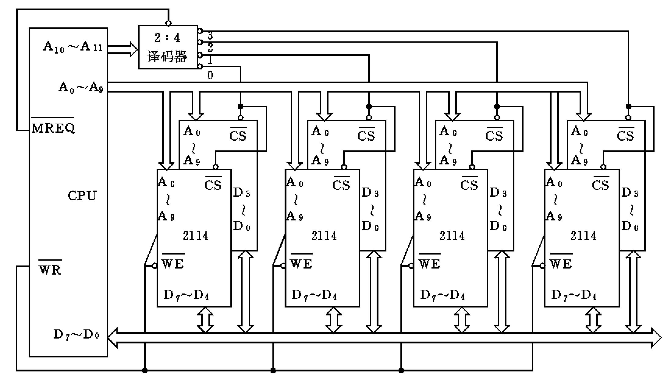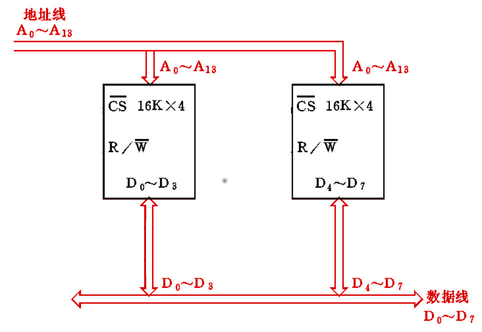 给定的芯片字长位数较短,不满足设计要求的存储器字长,此时需要用多片给定芯片扩展字长位数。三组信号线中,地址线和控制线公用而数据线单独分开连接。